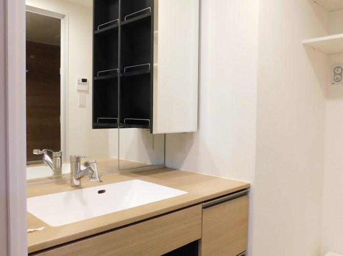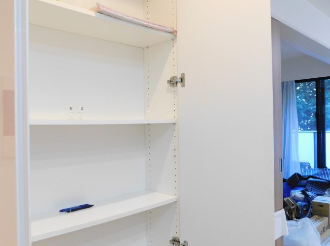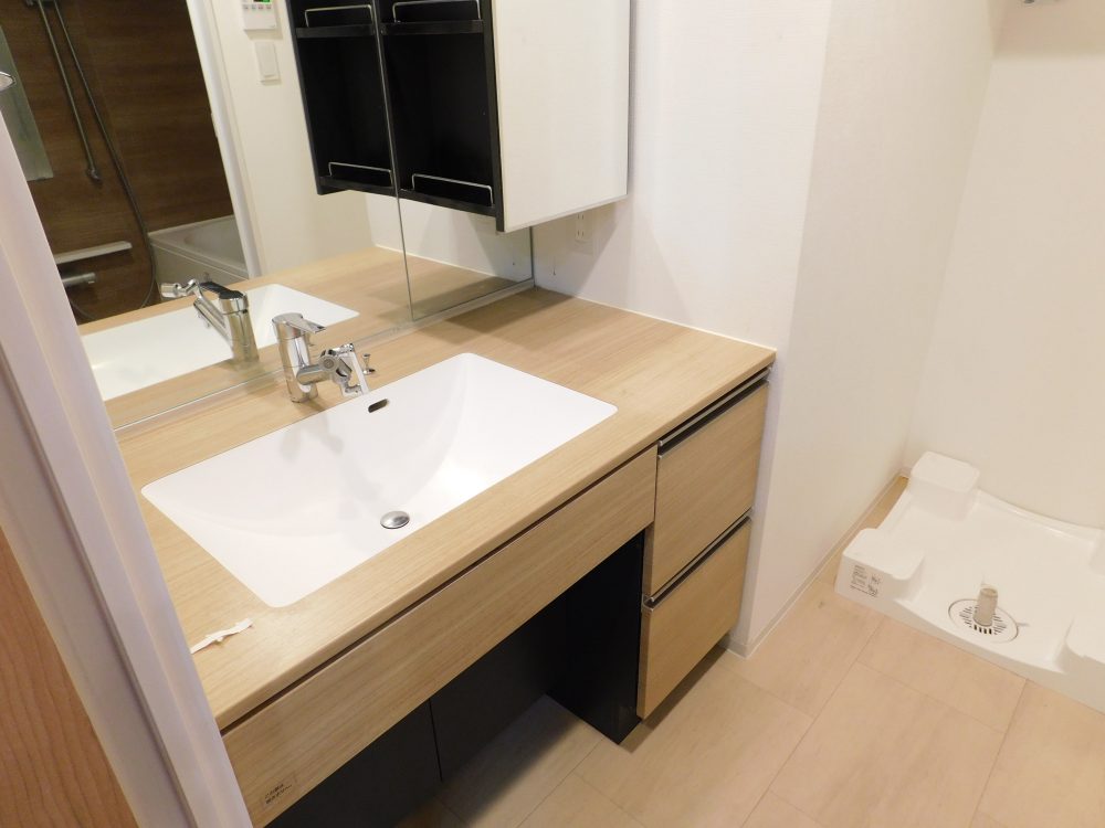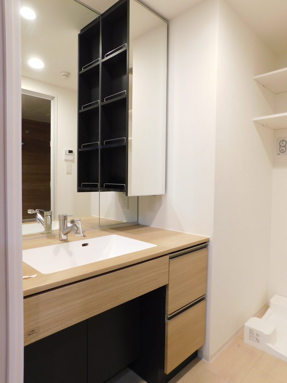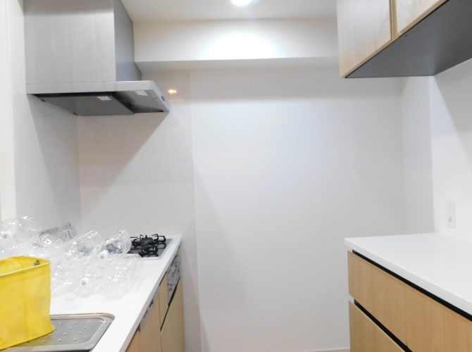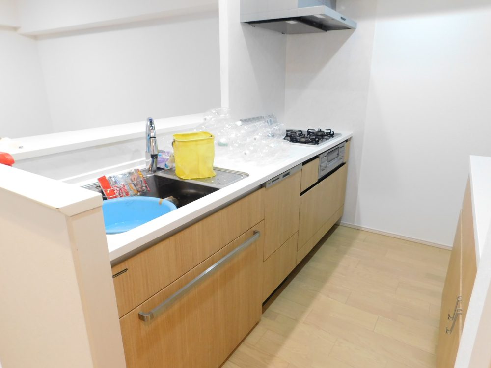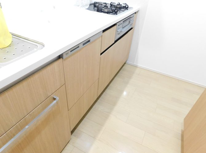 浄水器一体型タッチレス水栓や、食器洗い乾燥機、かくれんBOX、ソフトクローズ機能付キッチン収納、備え付け食器棚